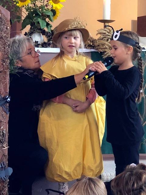 Dass der Kindergarten "Grabbenescht" unseren Erntedankgottesdienst mitgestaltet, gehört ja inzwischen fast zur Tradition. In diesem Jahr zog zu Beginn eine große Ameisenhorde durch die vollbesetzten Reihen der Marienkirche: "Wir sind klein, doch ziemlich viele, und wir haben Großes vor", rappten Kinder und Betreuer, bevor sie ganz vorne auf den Altarstufen ihren Platz einnahmen und die große Bühne sichtlich genossen. Im Anspiel mit Ameise und Samenkorn zeigte sich, dass es manchmal ganz gut ist, zu vertrauen und zu warten. Naja, ein Vertrag hilft sicher beim Vertrauen, auch dann, wenn er zwischen einer kleinen Ameise und einem ziemlich schlauen Samenkorn geschlossen wird.